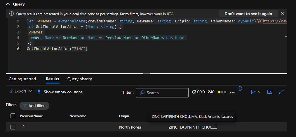 Use the following query on Microsoft Defender XDR and other Microsoft security products supporting the Kusto query language (KQL) to get information about a threat actor using the old name, new name, or industry name.
