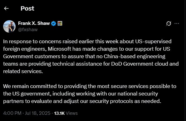 This past week it was discovered that Microsoft DoD services were being managed by China-based engineering teams. Considering the current landscape that was met with concern from all over.
